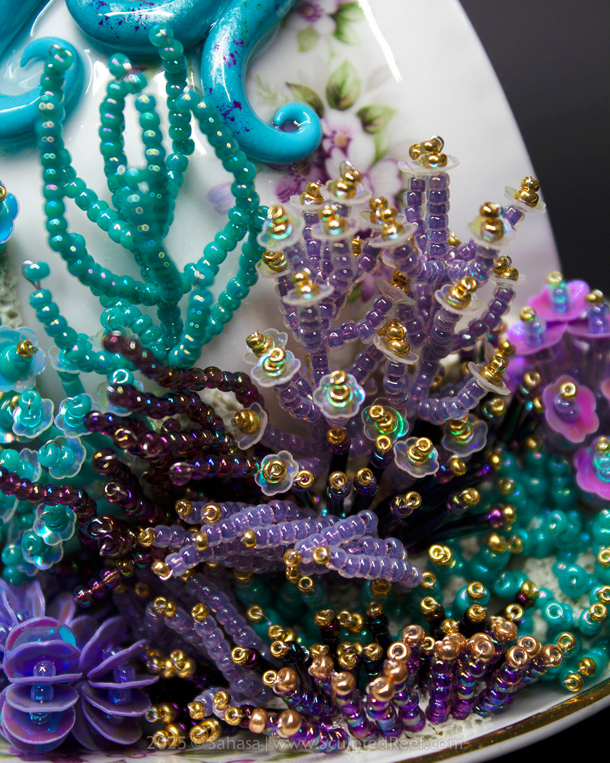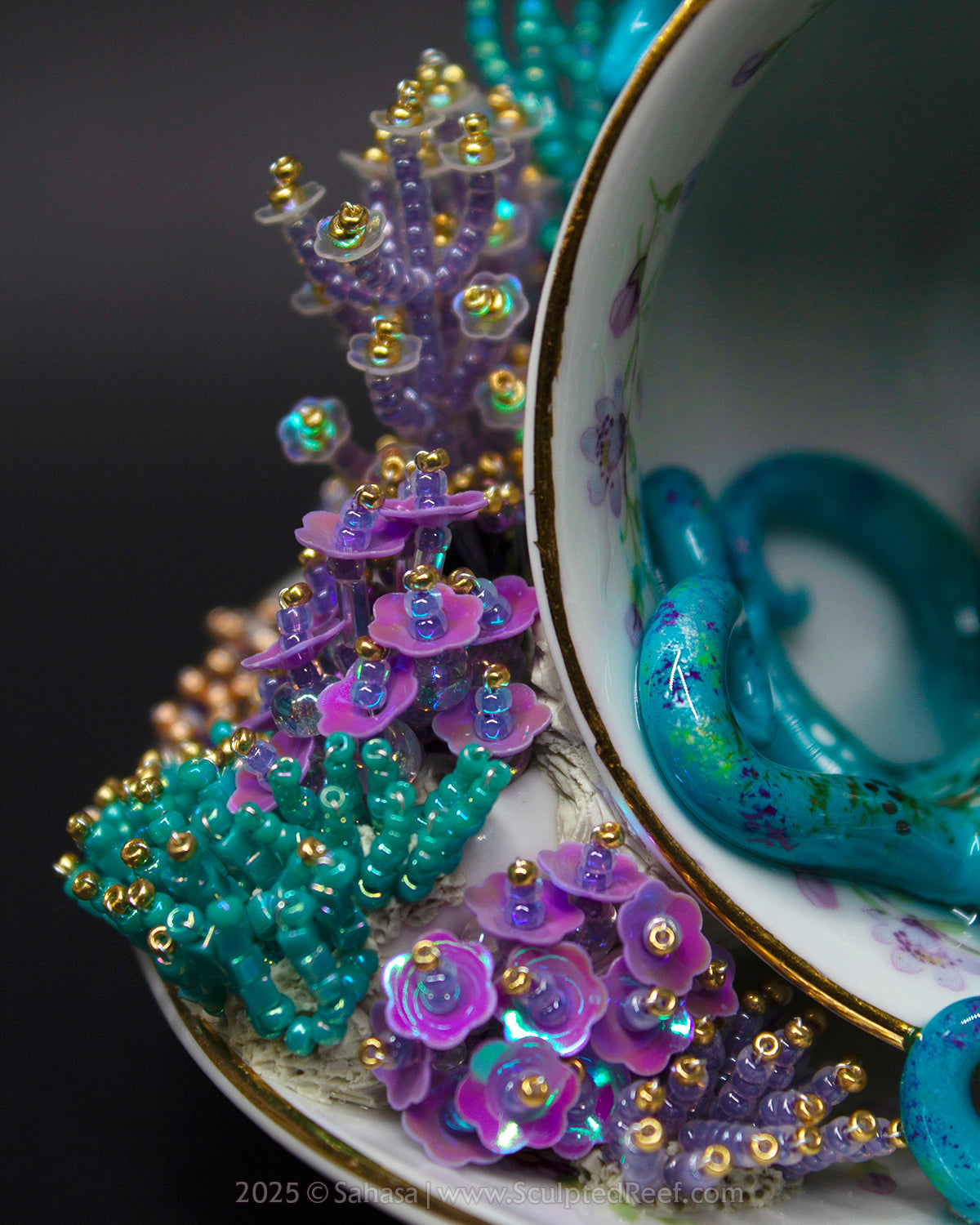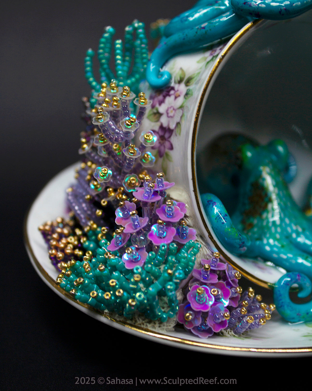 The exterior of this tea cup turned octopus den is generously covered in corals, patiently hand beaded by the artist with lots of love and attention to detail. The corals are made from a mixture of materials but primarily consist of superior quality Miyuki rocailles and delica's. All beads and paillettes are set on many metres of silver wire.