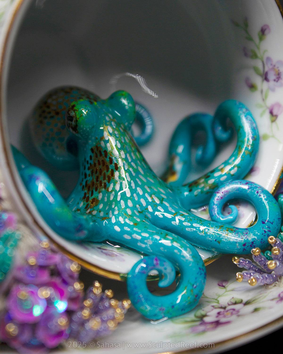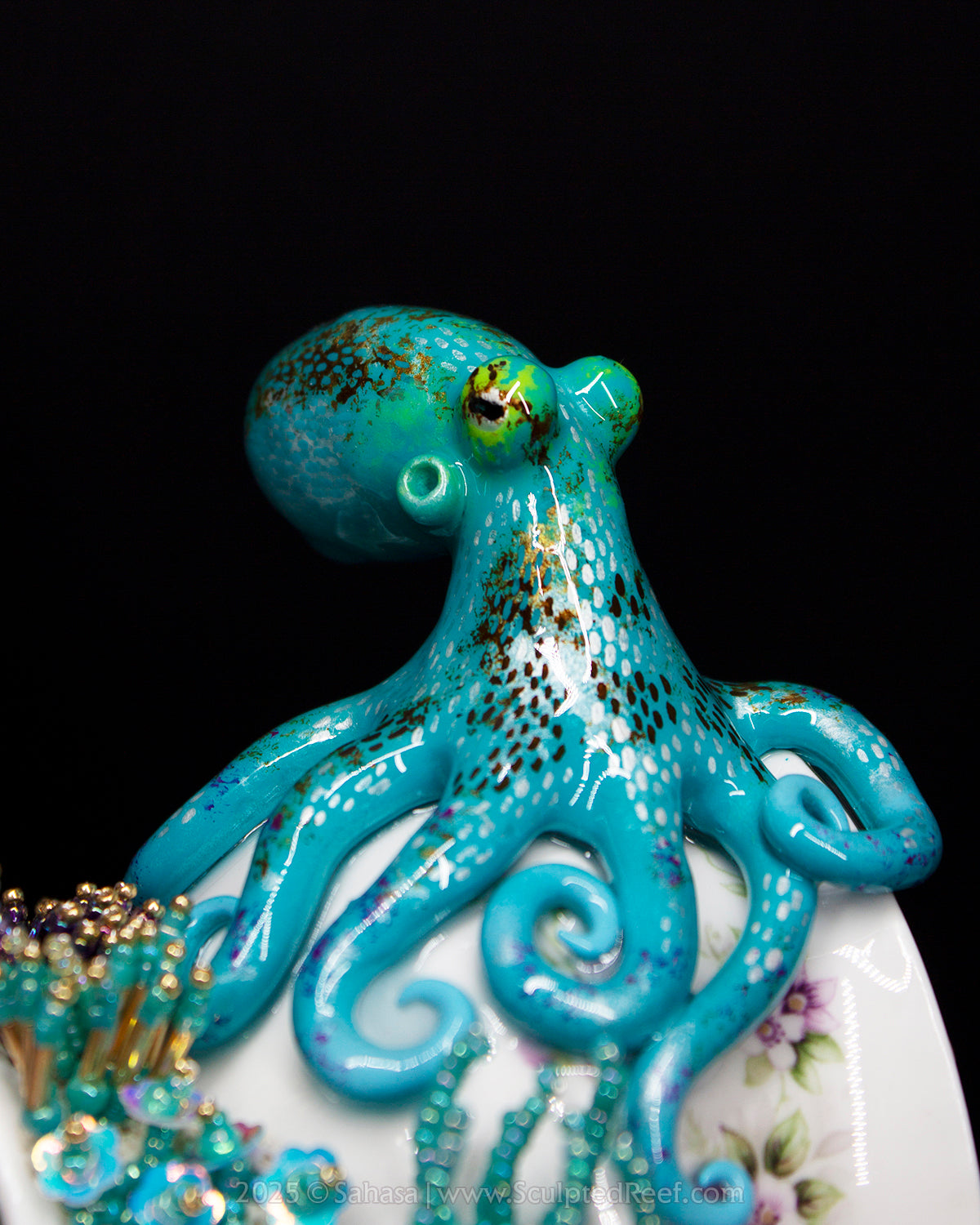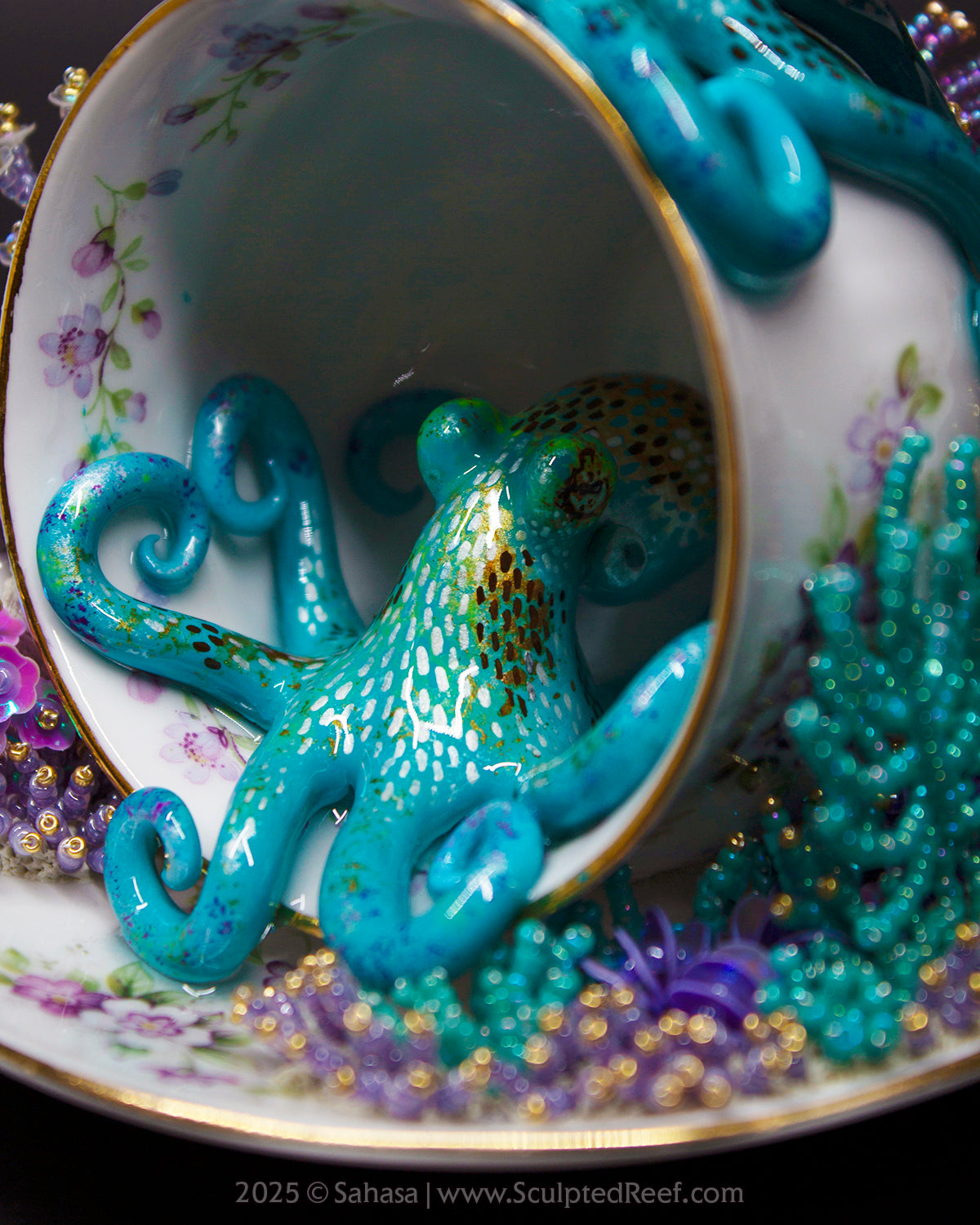 The octopuses on this piece are hand sculpted from polymer clay and lovingly painted to resemble the species "Octopus briareus" also known as the Caribbean Reef Octopus. One octopus is cosily tucked inside the vintage tea cup, the other sits on top.