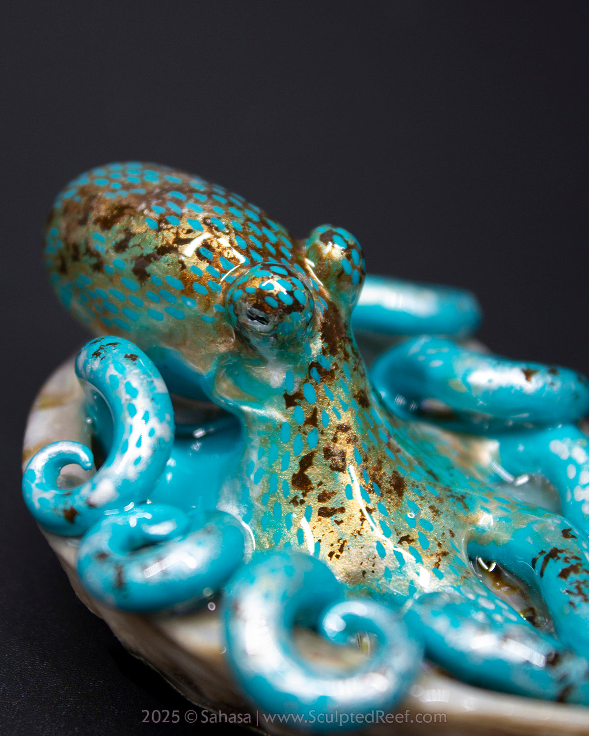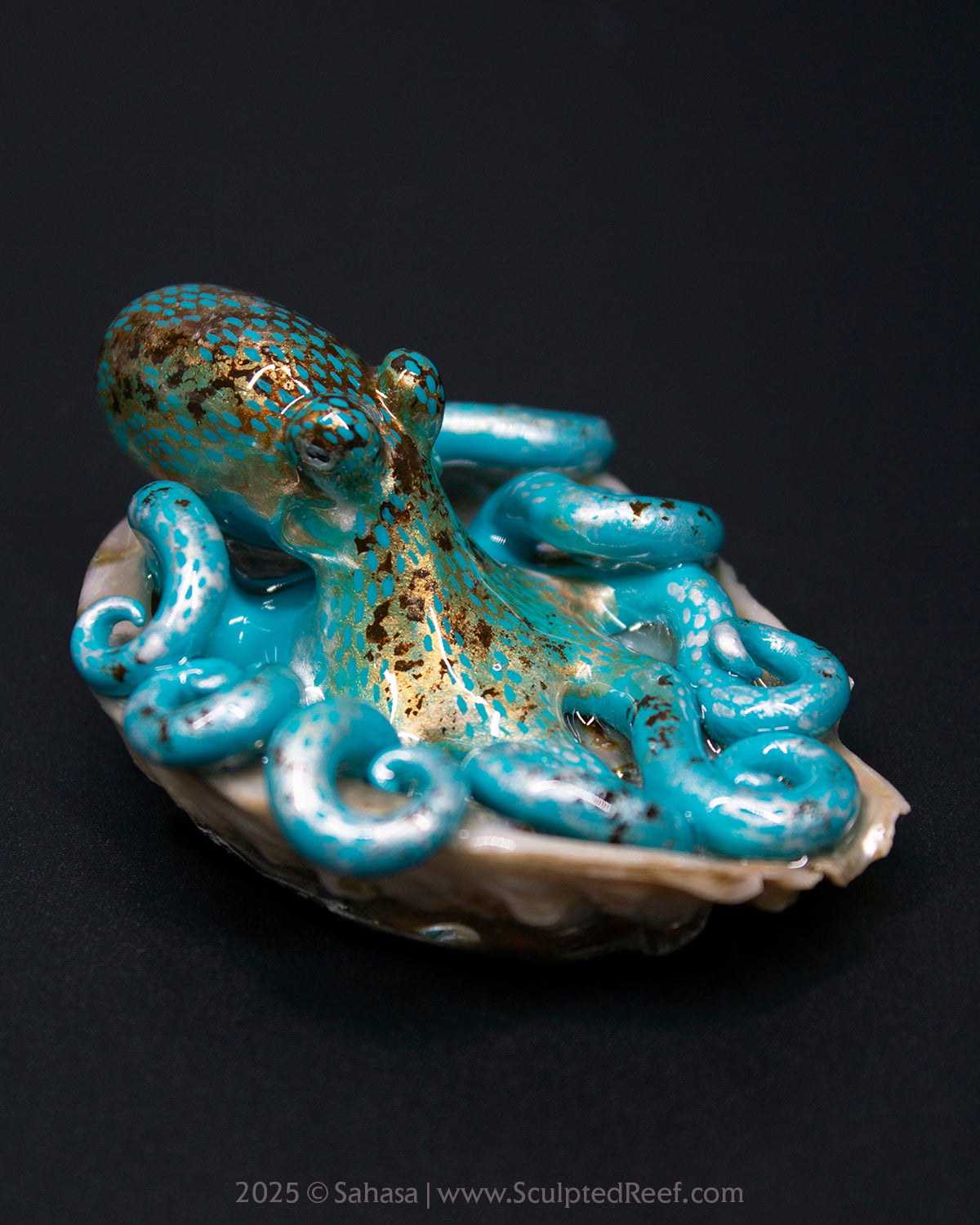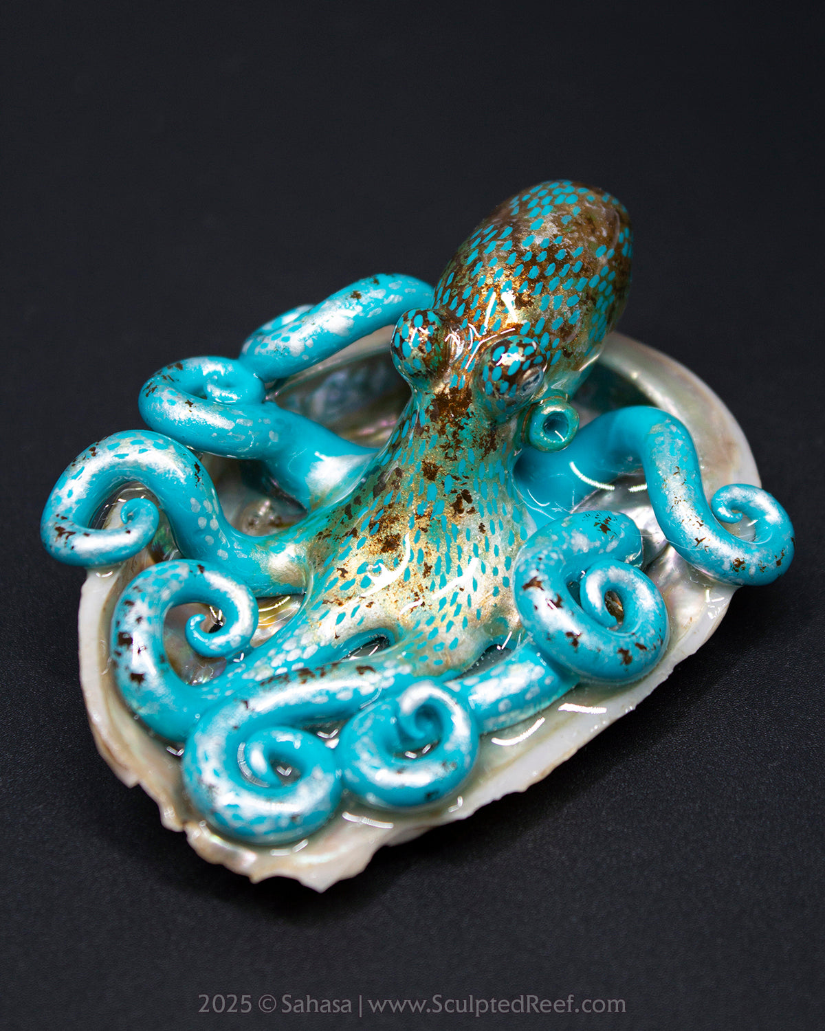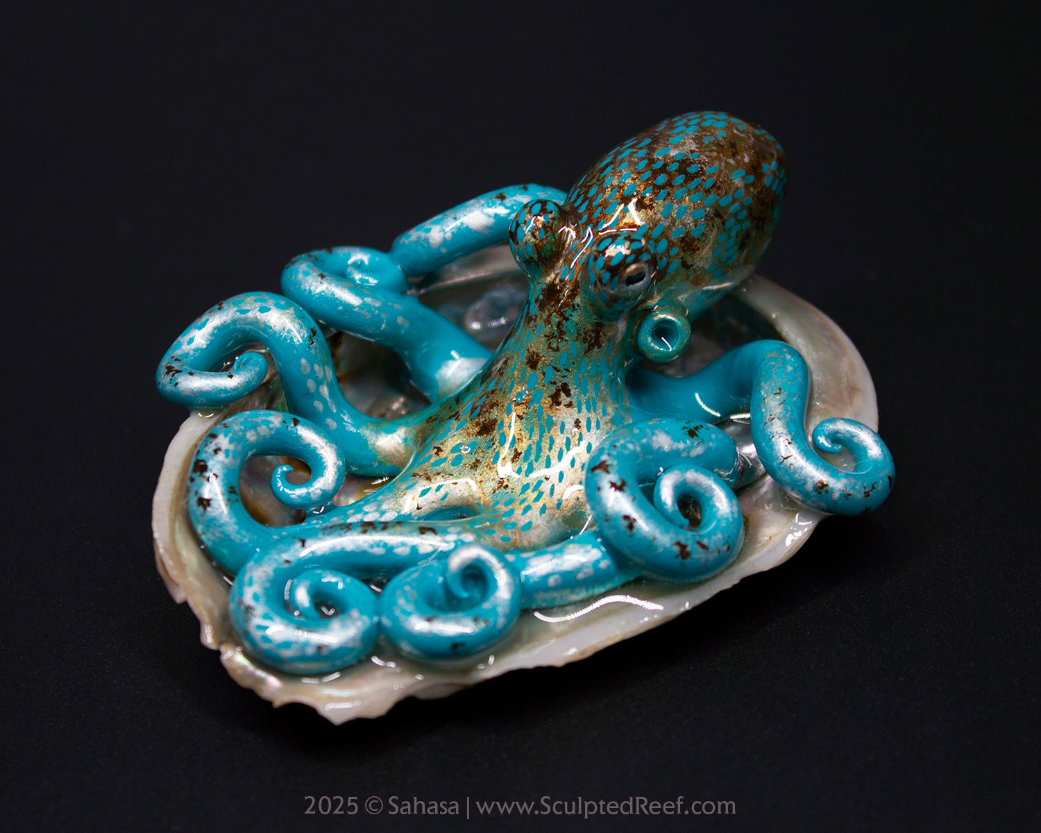 ✪ Description: This Shelltopus is hand sculpted from polymer clay and has been carefully painted with artist's quality paints, resembling the species Octopus briareus or Caribbean Reef Octopus. It is attached to a shell and coated in resin.