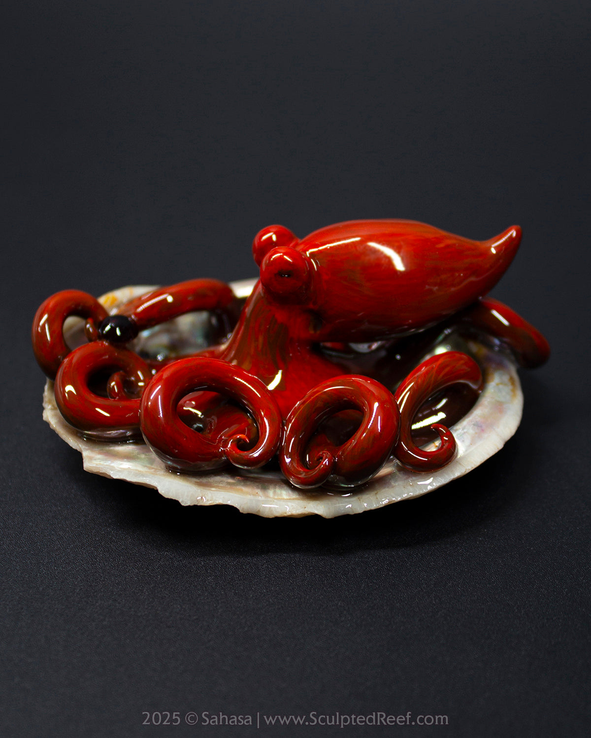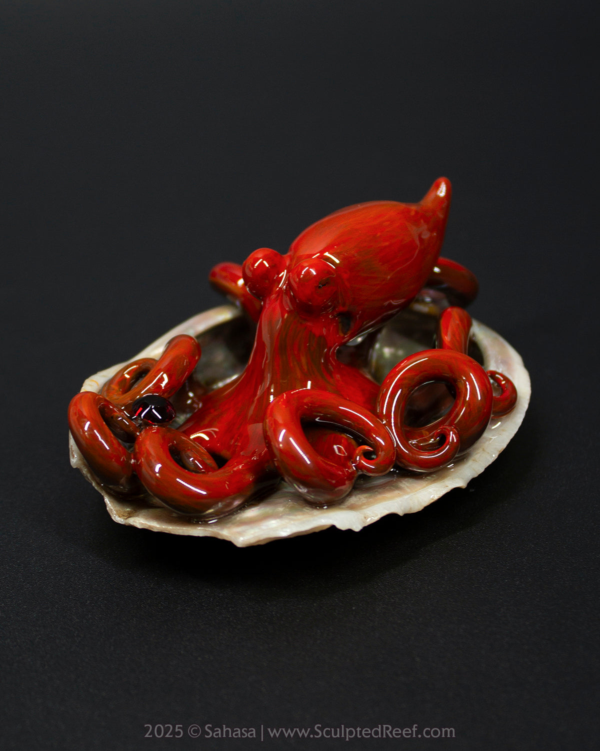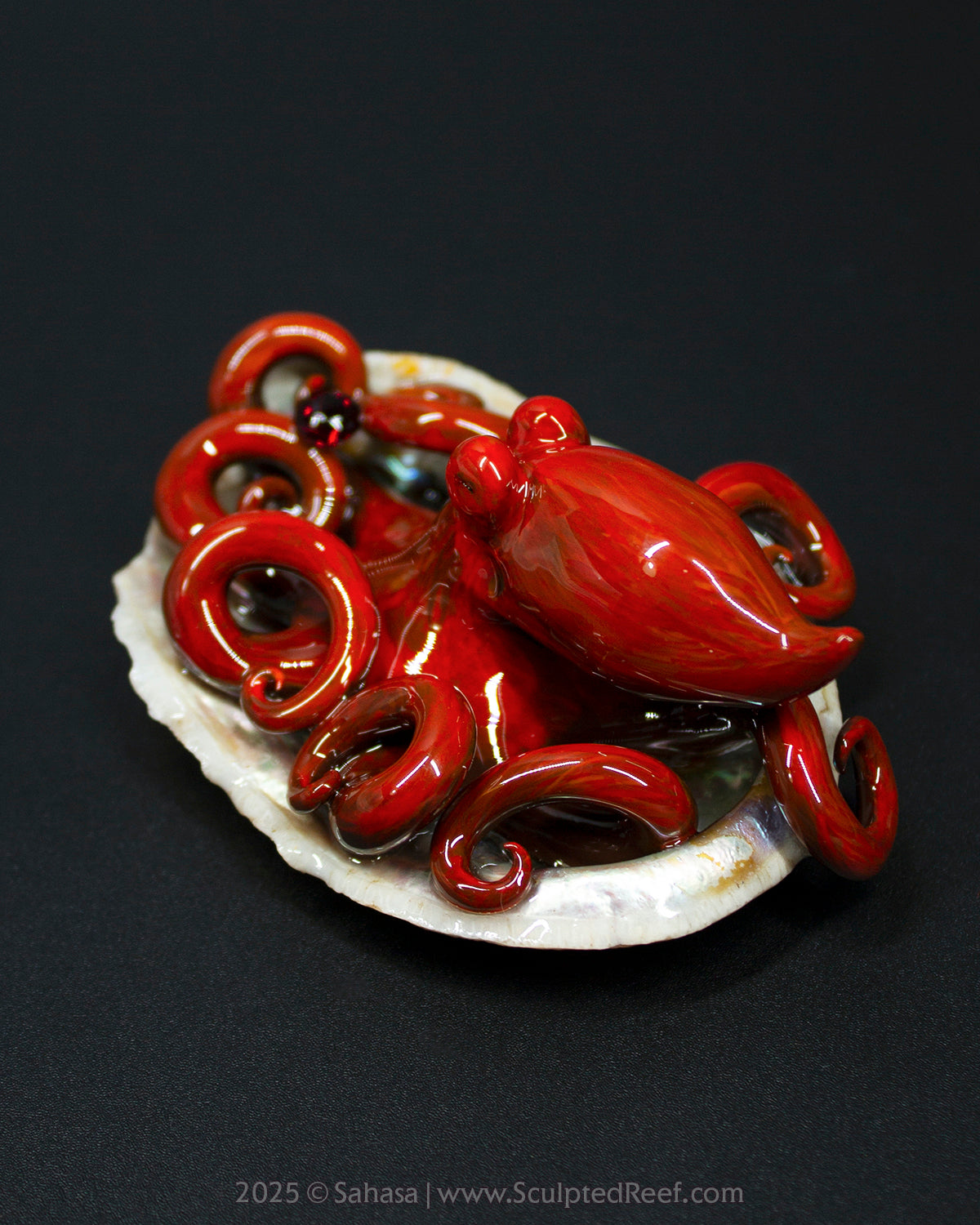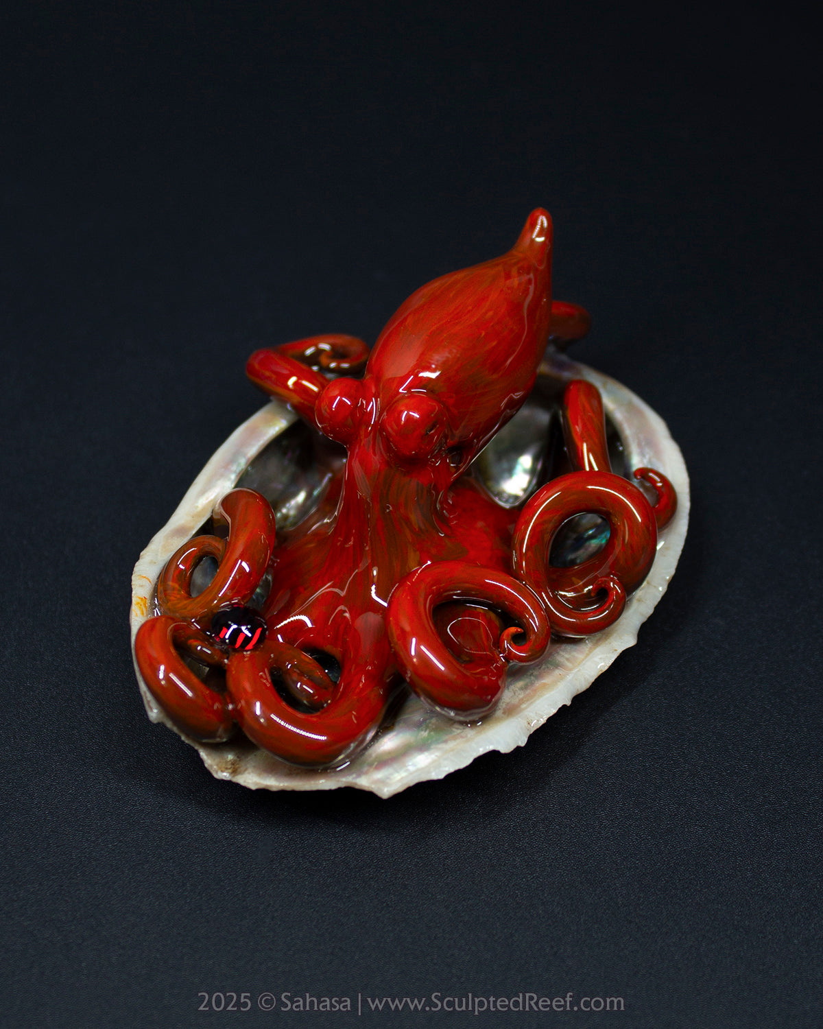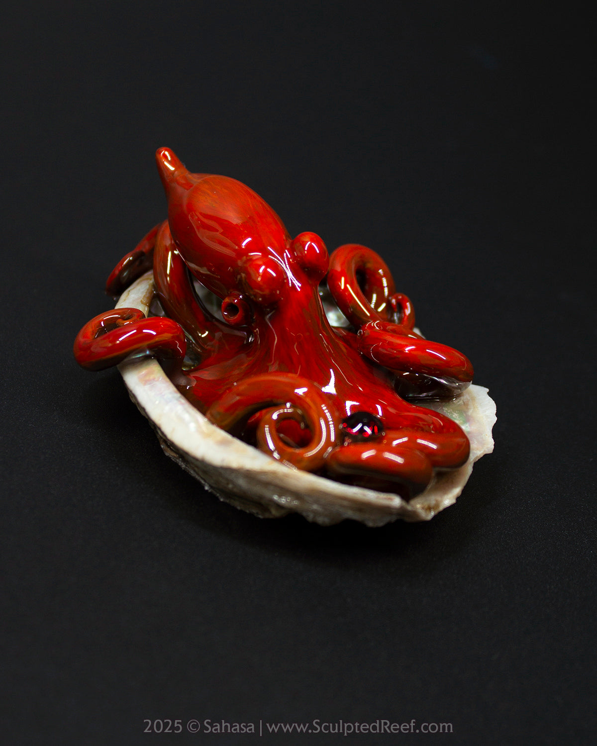 ✪ Description: This Shelltopus is hand sculpted from polymer clay and has been carefully painted with artist's quality paints to resemble the species Giant Pacific Octopus, scientifically known as Enteroctopus dofleini. It is attached to a shell and coated in resin. It's holding a red Swarovski crystal.
