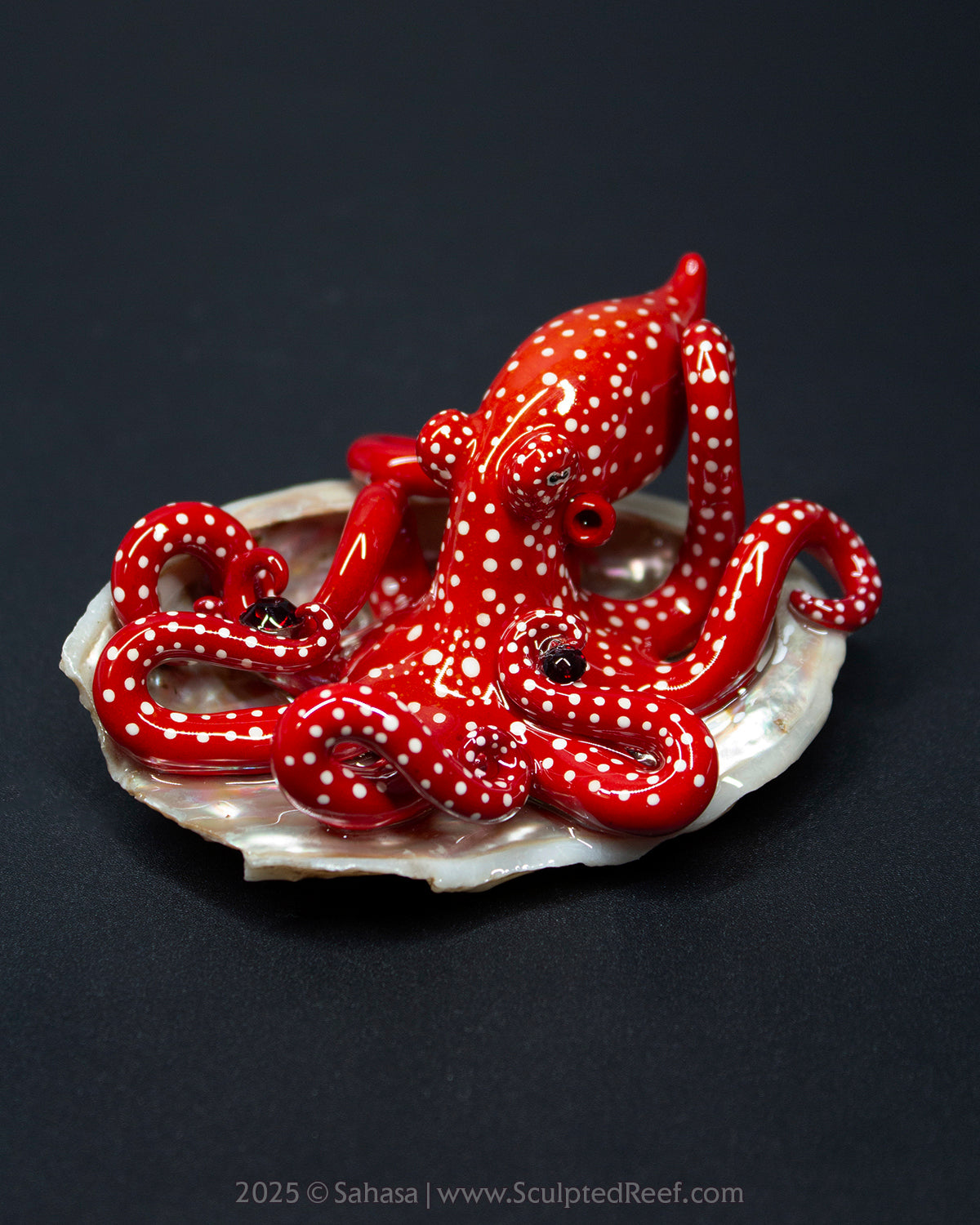 ✪ Description: This Shelltopus is hand sculpted from polymer clay and has been carefully painted with artist's quality paints, resembling a Starry Night Octopus, scientific name: Callistoctopus luteus. It is attached to a shell and coated in resin, and holding two Swarovski crystals.