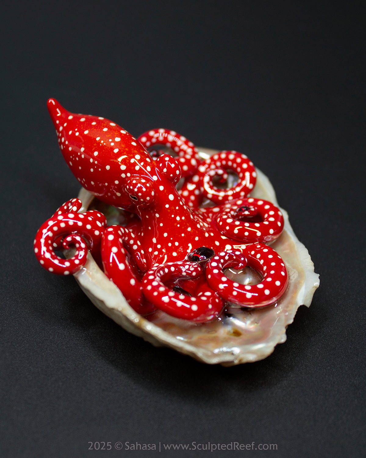 ✪ Description: This Shelltopus is hand sculpted from polymer clay and has been carefully painted with artist's quality paints, resembling a Starry Night Octopus, scientific name: Callistoctopus luteus. It is attached to a shell and coated in resin, and holding red Swarovski crystals.